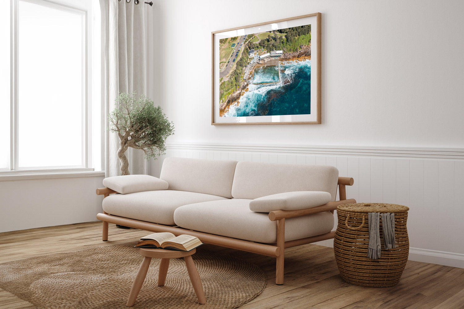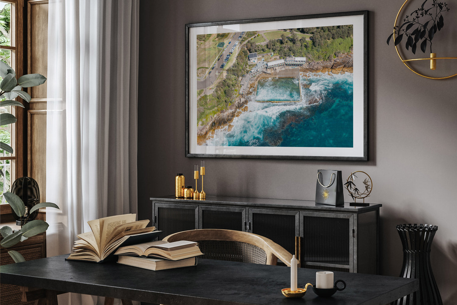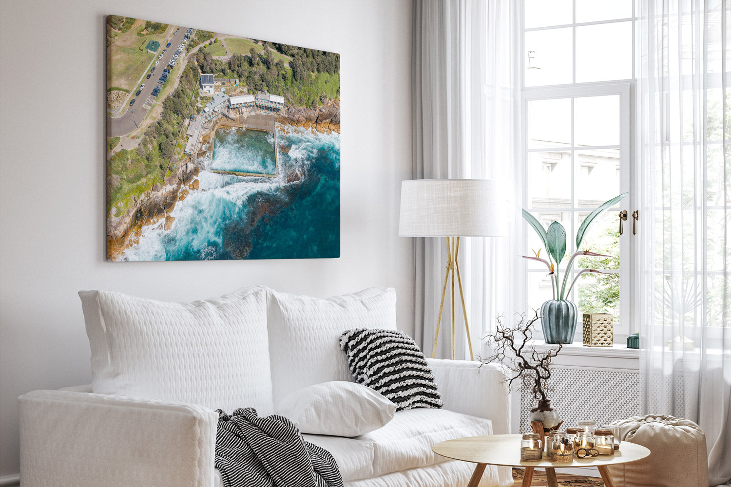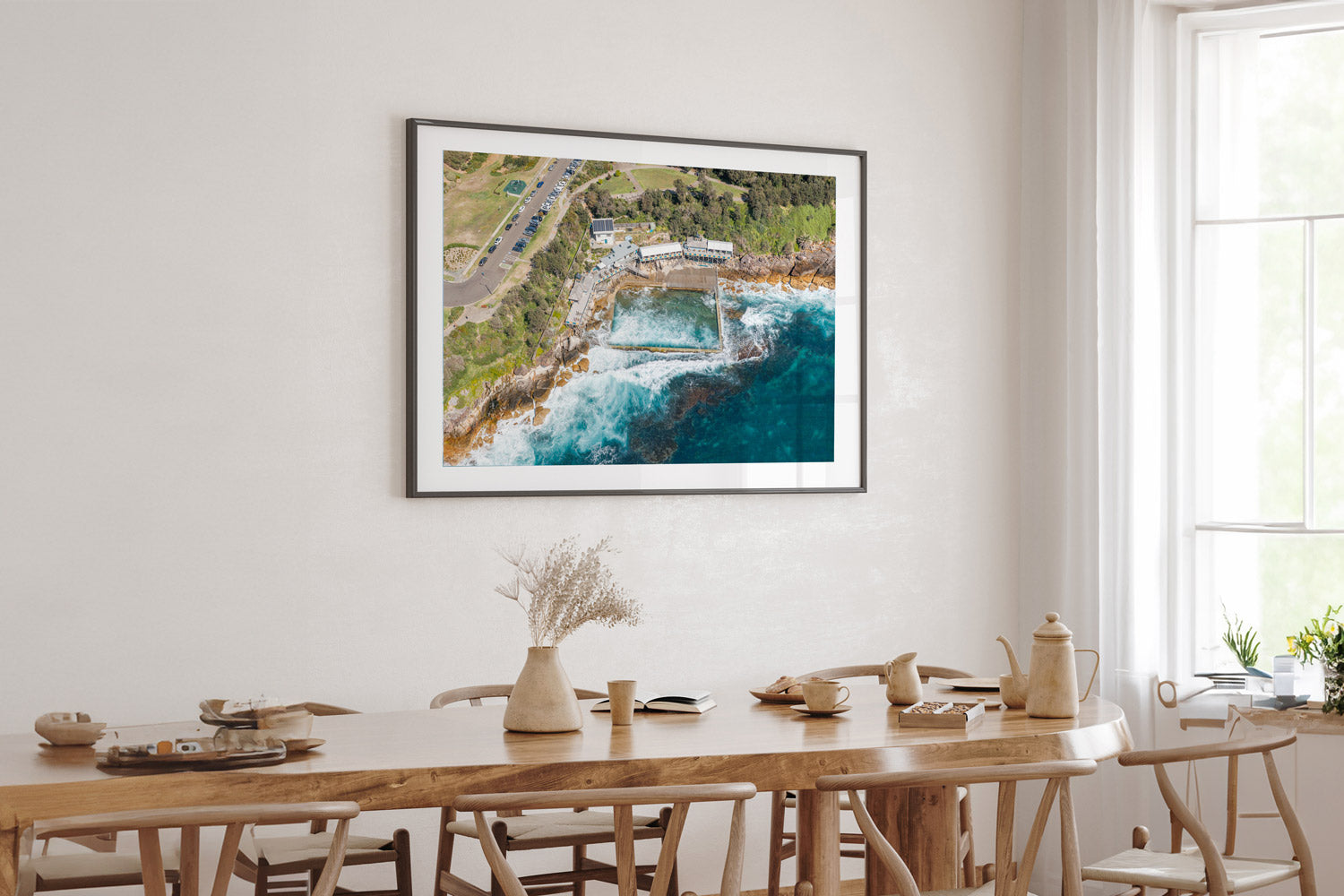 Wylie's Baths Coogee Aerial offers a stunning bird’s eye view of one of Sydney’s most beloved ocean pools. Photographed from above, this fine art print reveals the turquoise water of the tidal pool, swimmers moving through the lanes, and the rugged rock shelf meeting the open ocean.