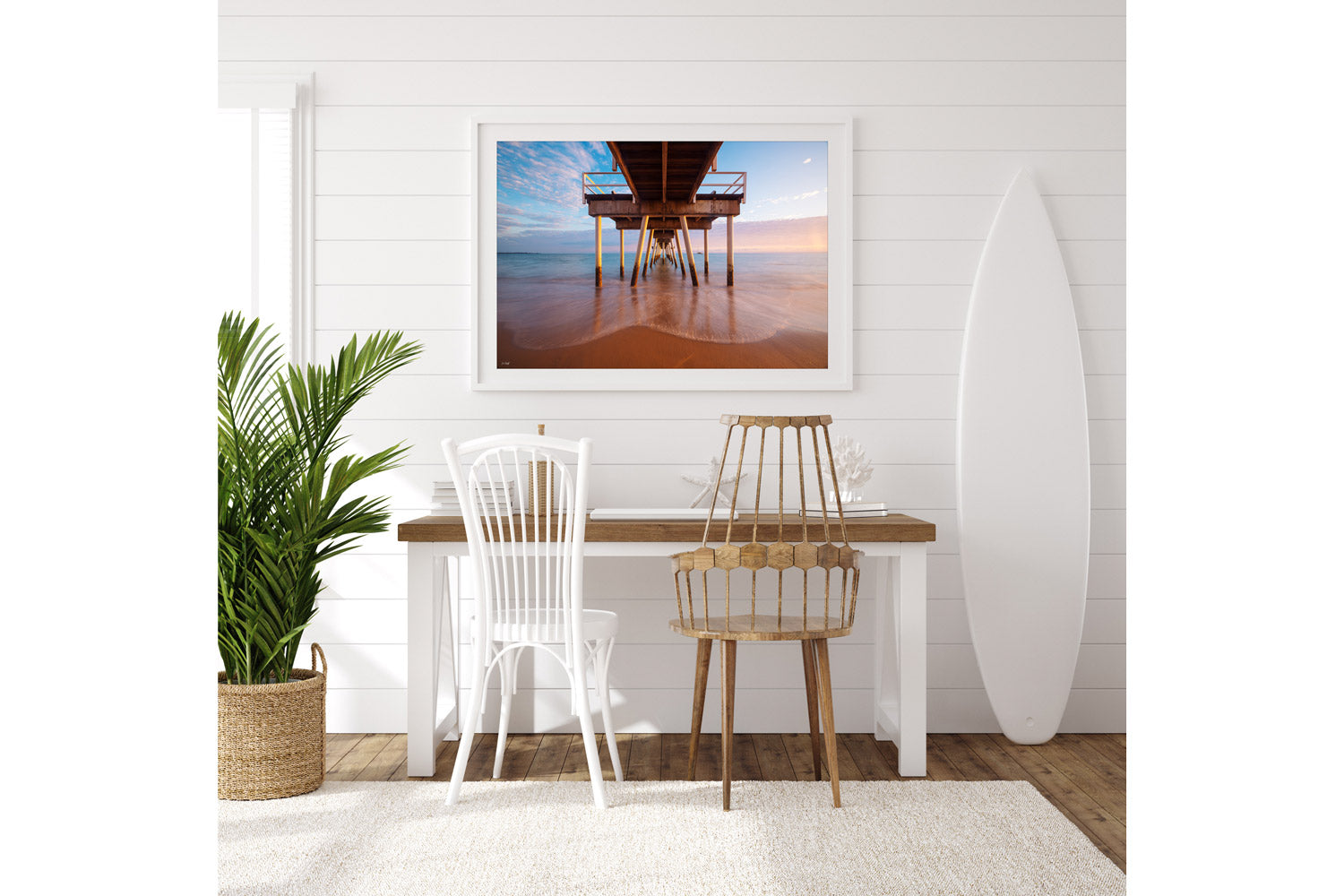 Torquay Jetty Colour captures the serene beauty of the iconic jetty in Hervey Bay, Australia, in a stunning palette of pastel blues, oranges, and yellows. This vibrant photograph, taken from beneath the jetty, highlights its towering structure and the interplay of light and water. On the right third of the image, a sailboat elegantly glides between the pillars, adding a sense of movement and life to the tranquil scene.
