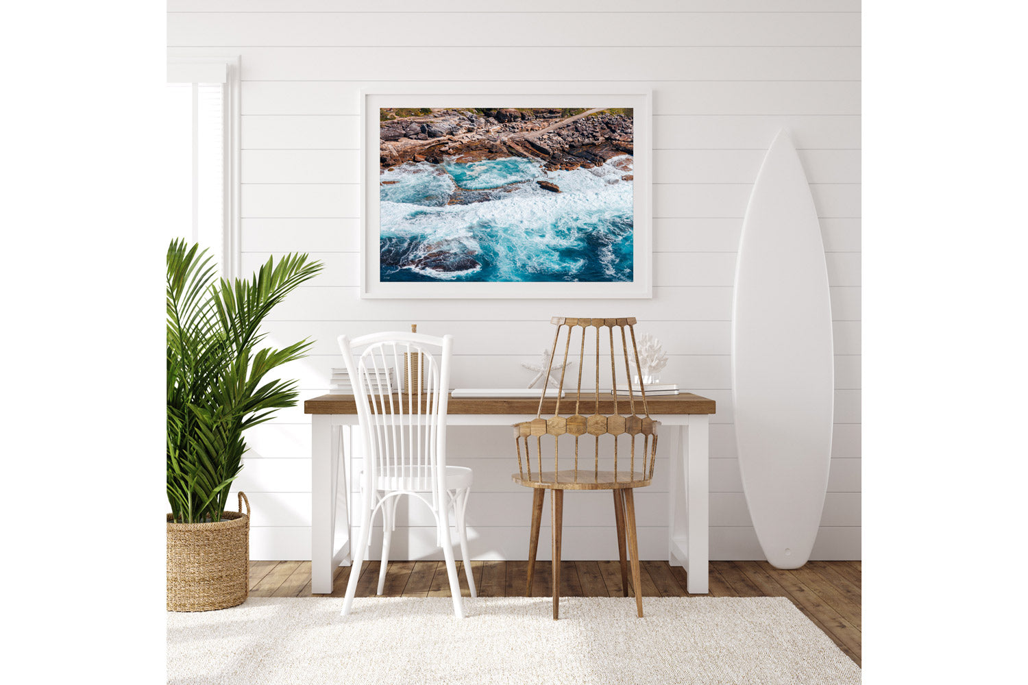 Mahon Pool Aerial Print captures the rugged beauty of Maroubra’s famous tidal pool from a dramatic top down perspective. This fine art aerial photograph showcases the rocky coastline, the natural contours of the sandstone shelf, the deep aqua of the ocean, and swimmers enjoying the raw, untamed atmosphere unique to Mahon Pool.
