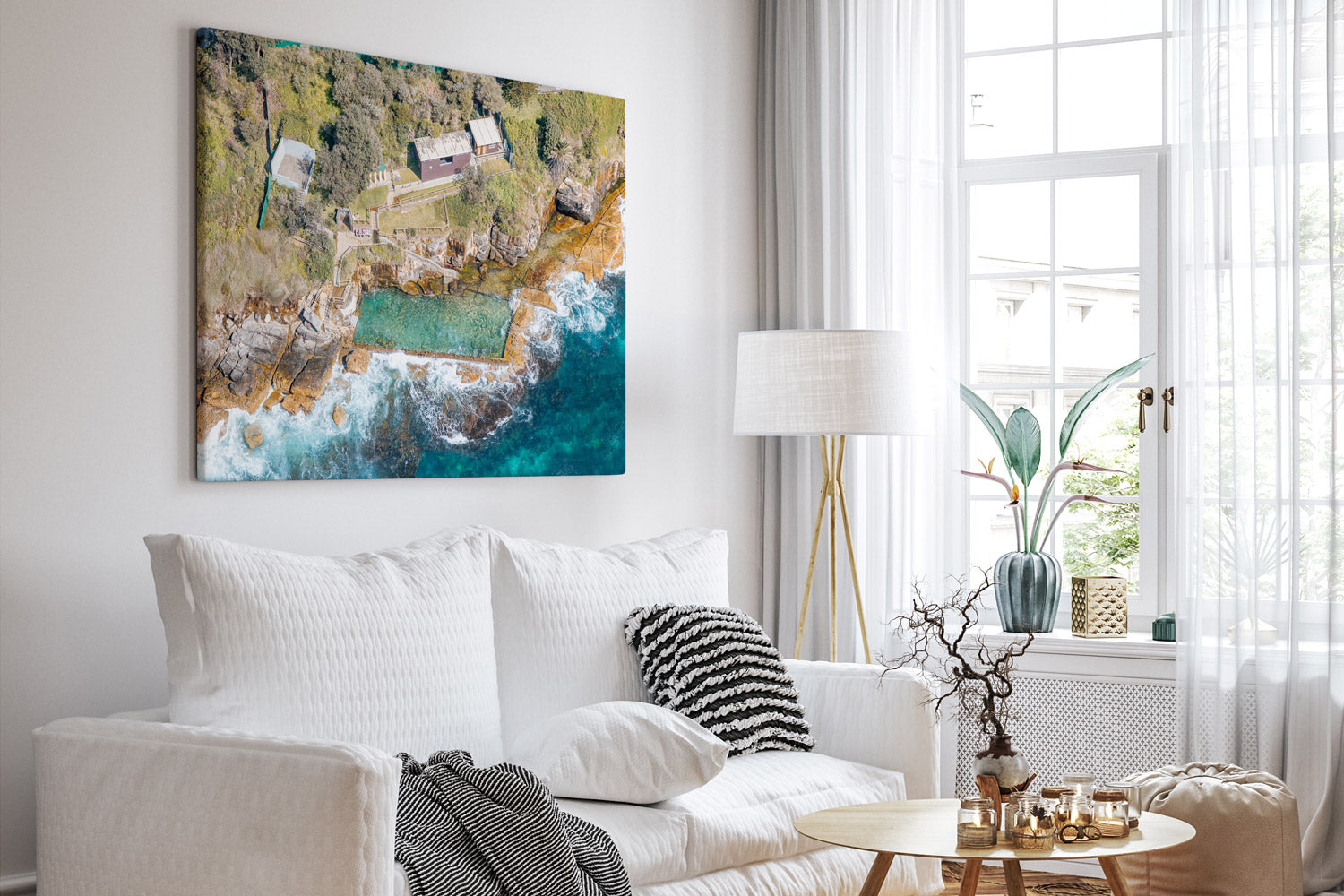 Each canvas is then sprayed with a liquid laminate, which not only enhances colour but also protects against UV fading, dust, minor scratches & water. Then expertly gallery wrapped over a stretcher bar made from quality Australian pine & finished with a tape seal backing & plastic coated hanging wire.