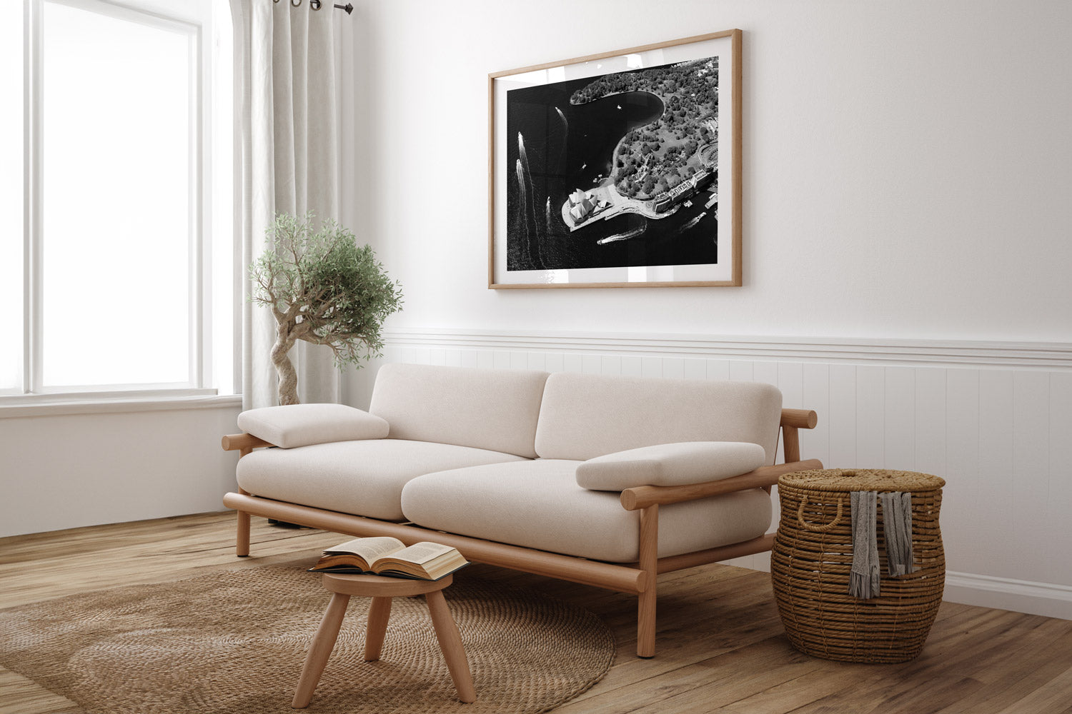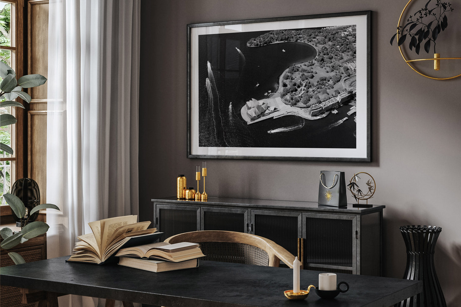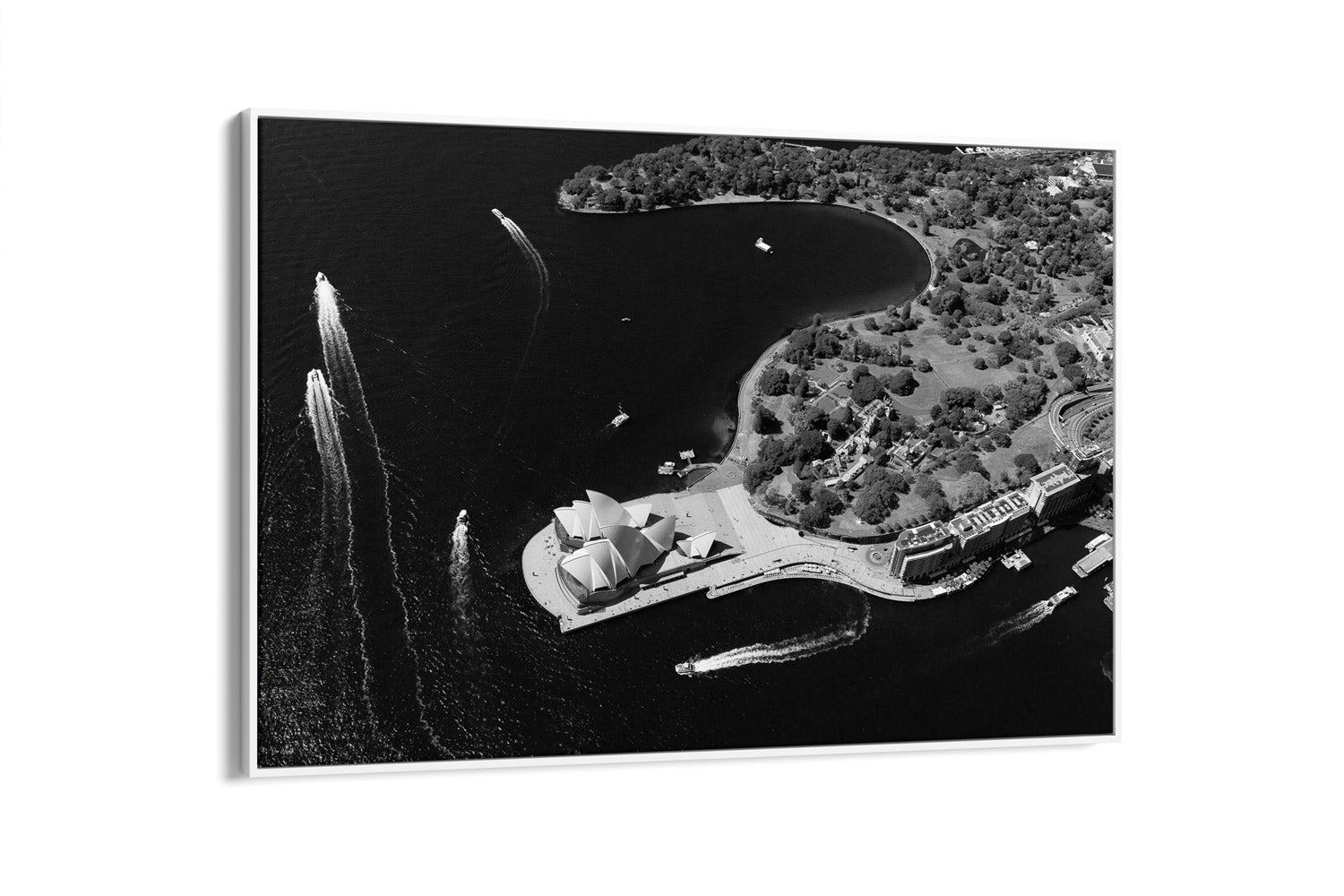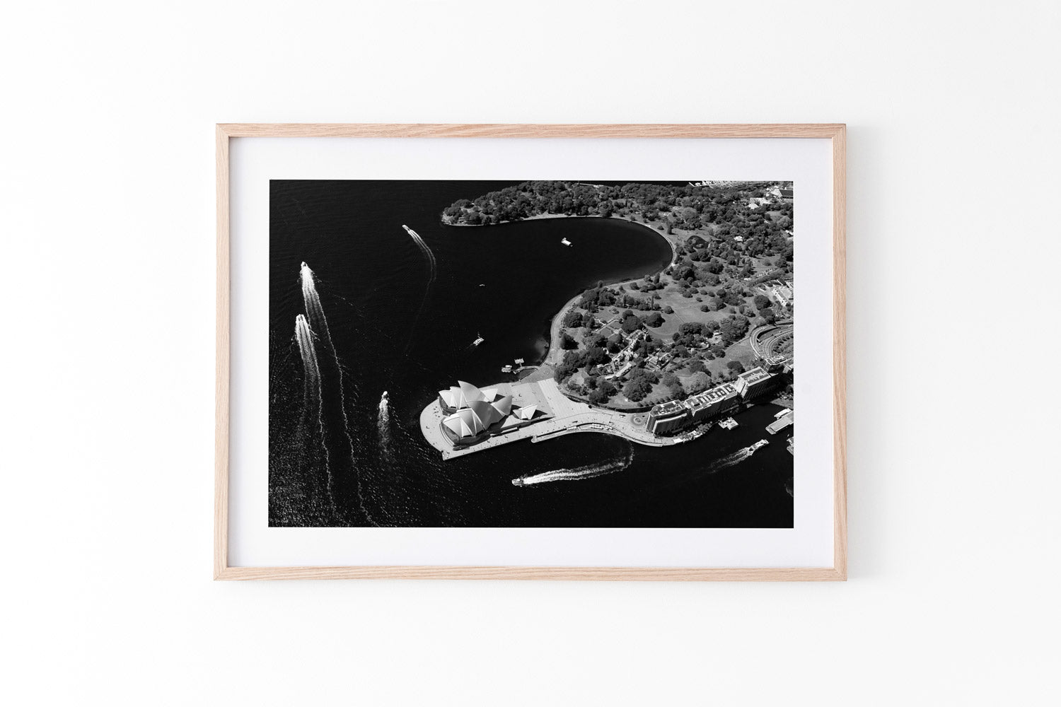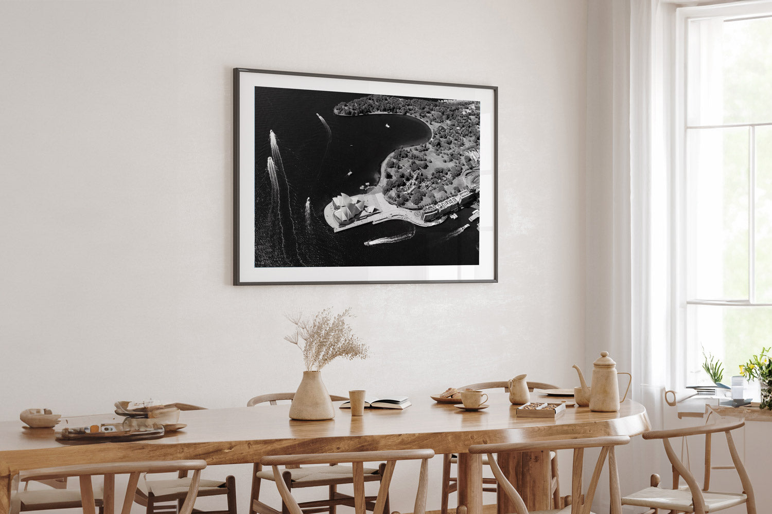 Opera House Aerial Landscape BW captures Sydney’s most iconic landmark from above in striking black and white detail. This fine art aerial photograph presents the Sydney Opera House surrounded by the deep tones of Sydney Harbour, creating a dramatic contrast that draws focus to the architecture’s unique geometry and form.