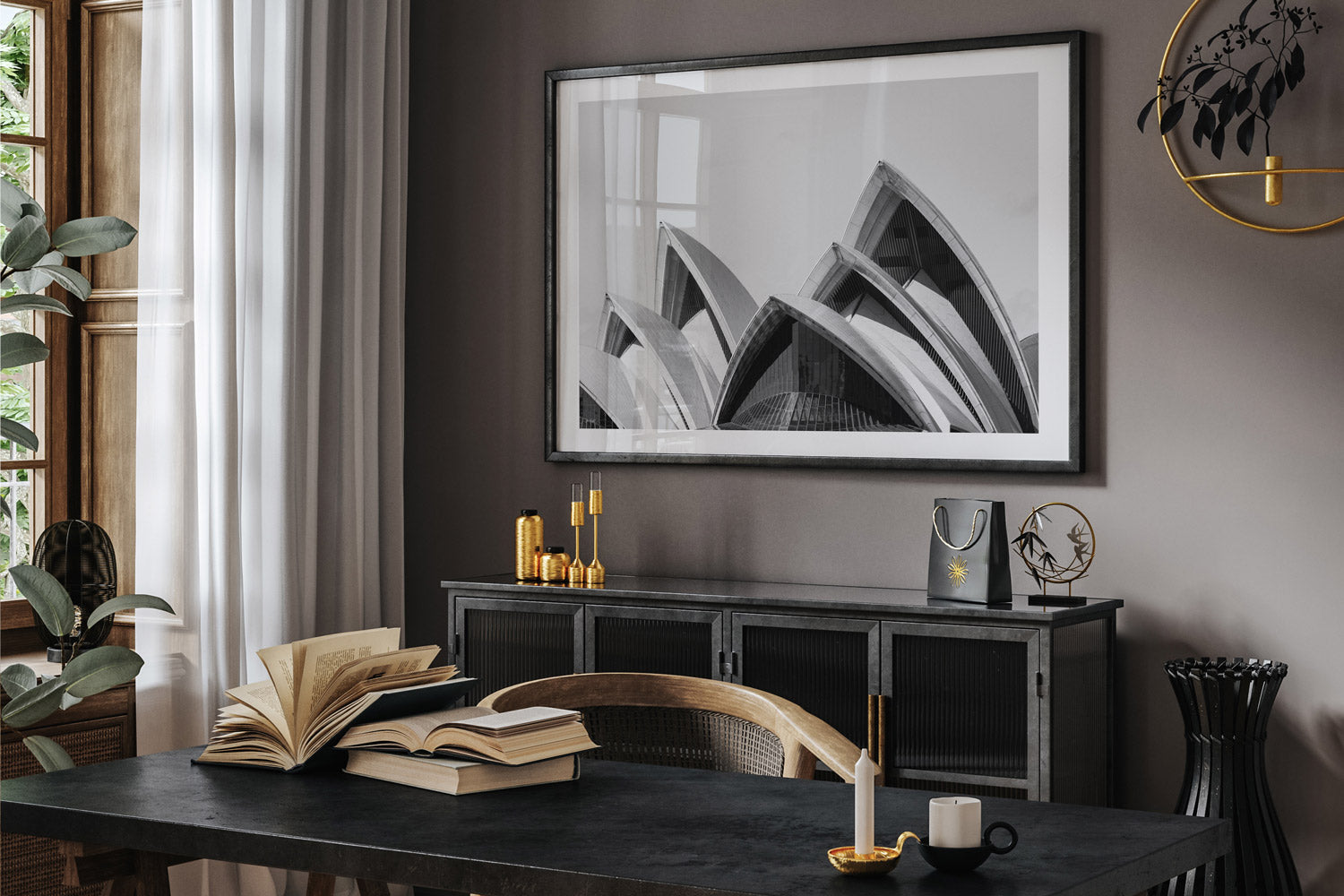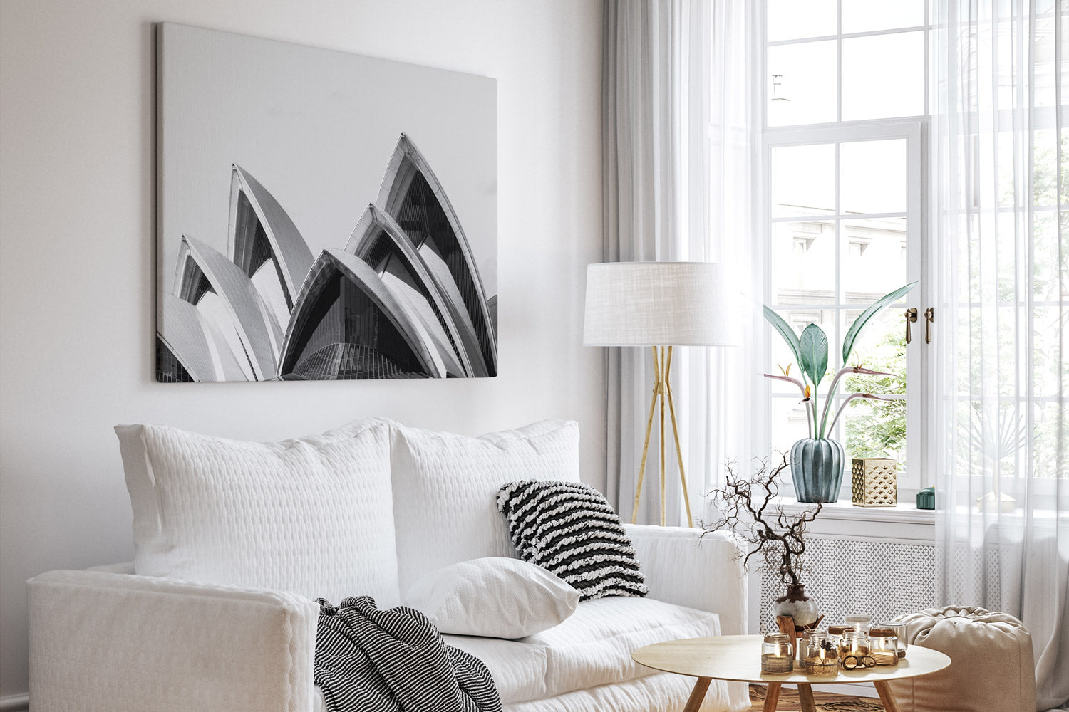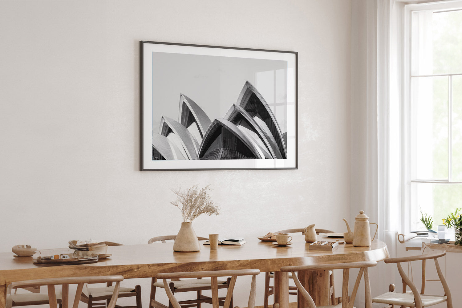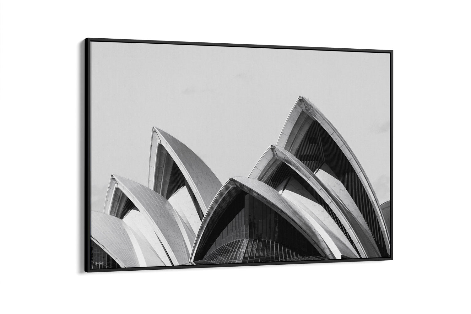The wide composition highlights the interplay between light and shadow across the tiled shells, revealing both the strength and delicacy of this modern architectural icon. Printed on premium fine-art materials, this piece brings timeless elegance and a distinctly Sydney aesthetic to any interior, perfect for collectors and design lovers alike.