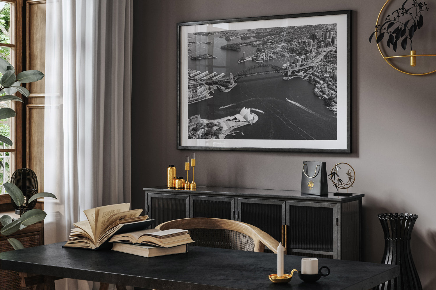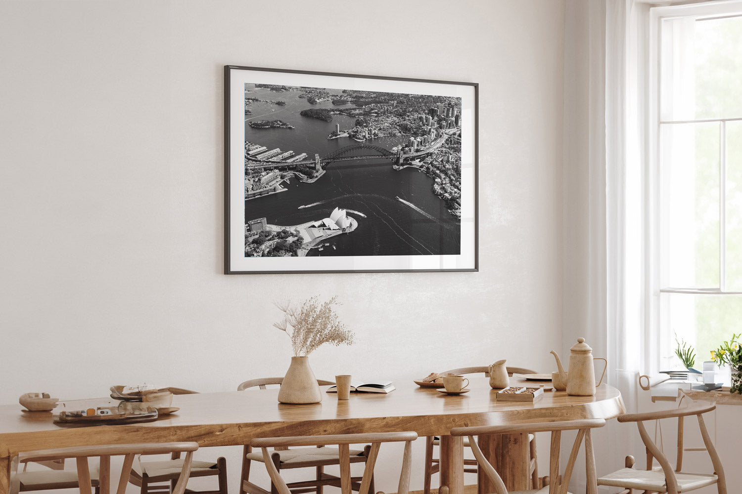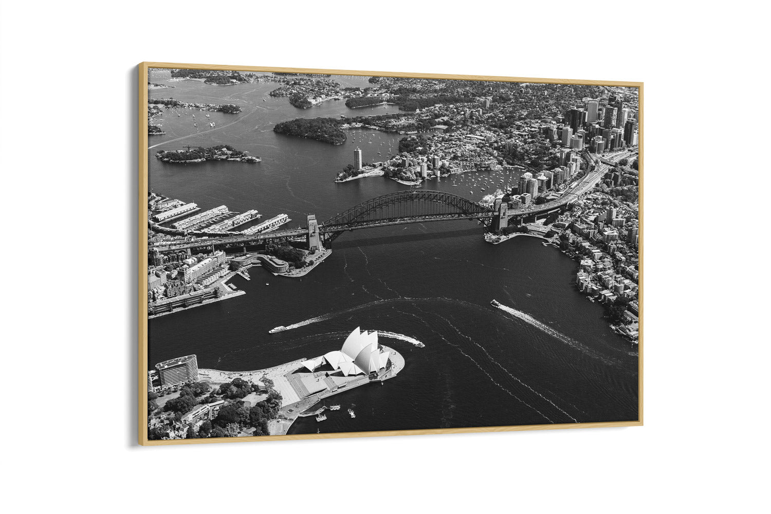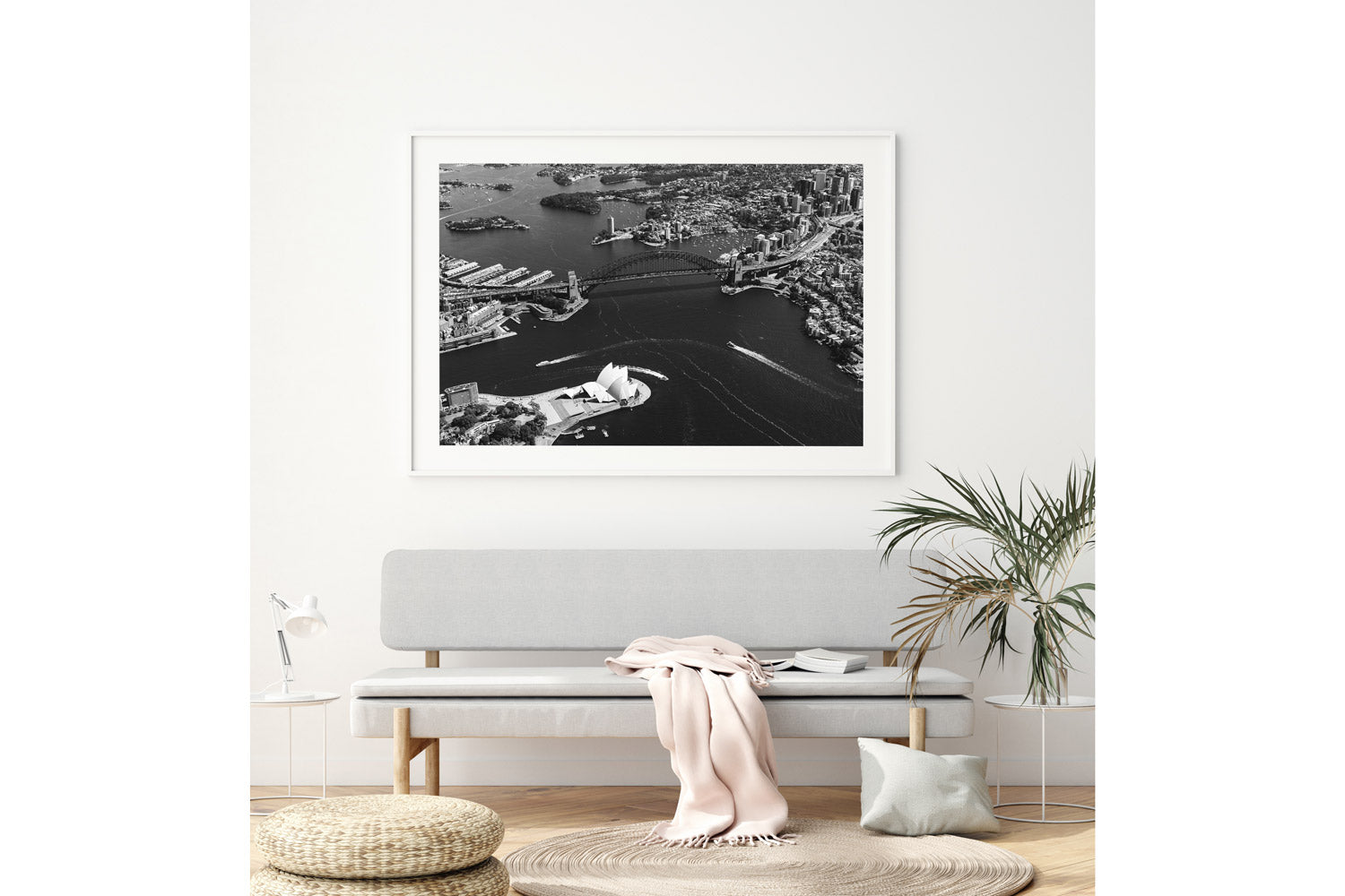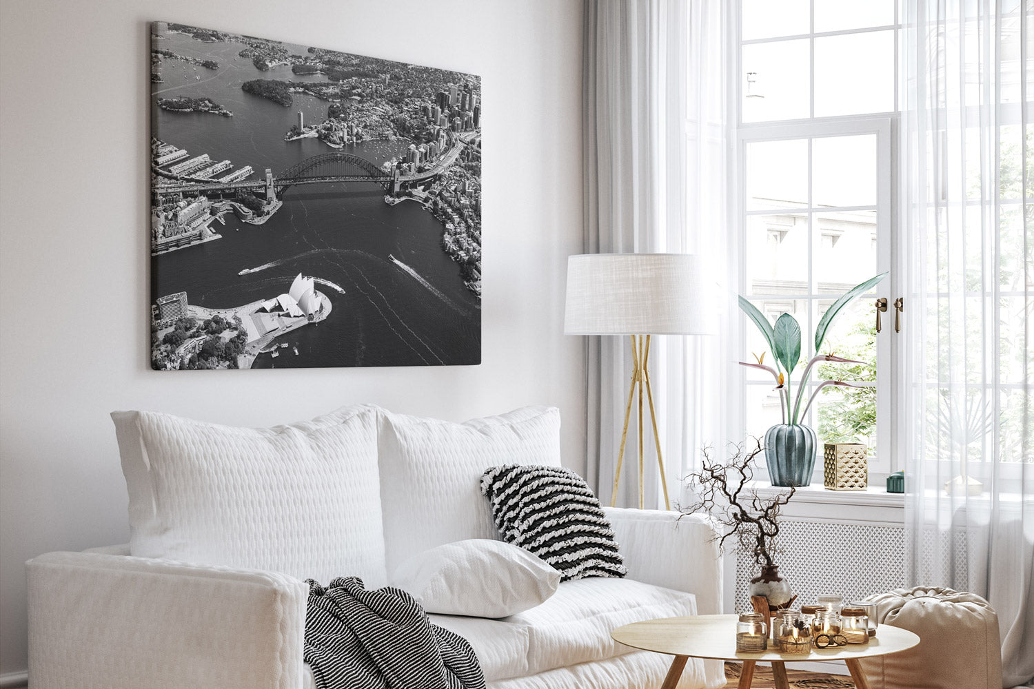 Sydney Harbour Aerial BW is a bold black and white fine art print that captures the essence of Sydney from above. This striking aerial photograph features the Sydney Harbour Bridge and Opera House surrounded by deep, inky water that makes the city’s architecture stand out in dramatic contrast.