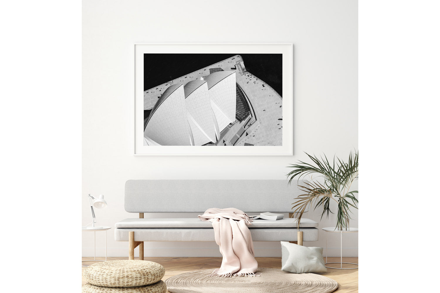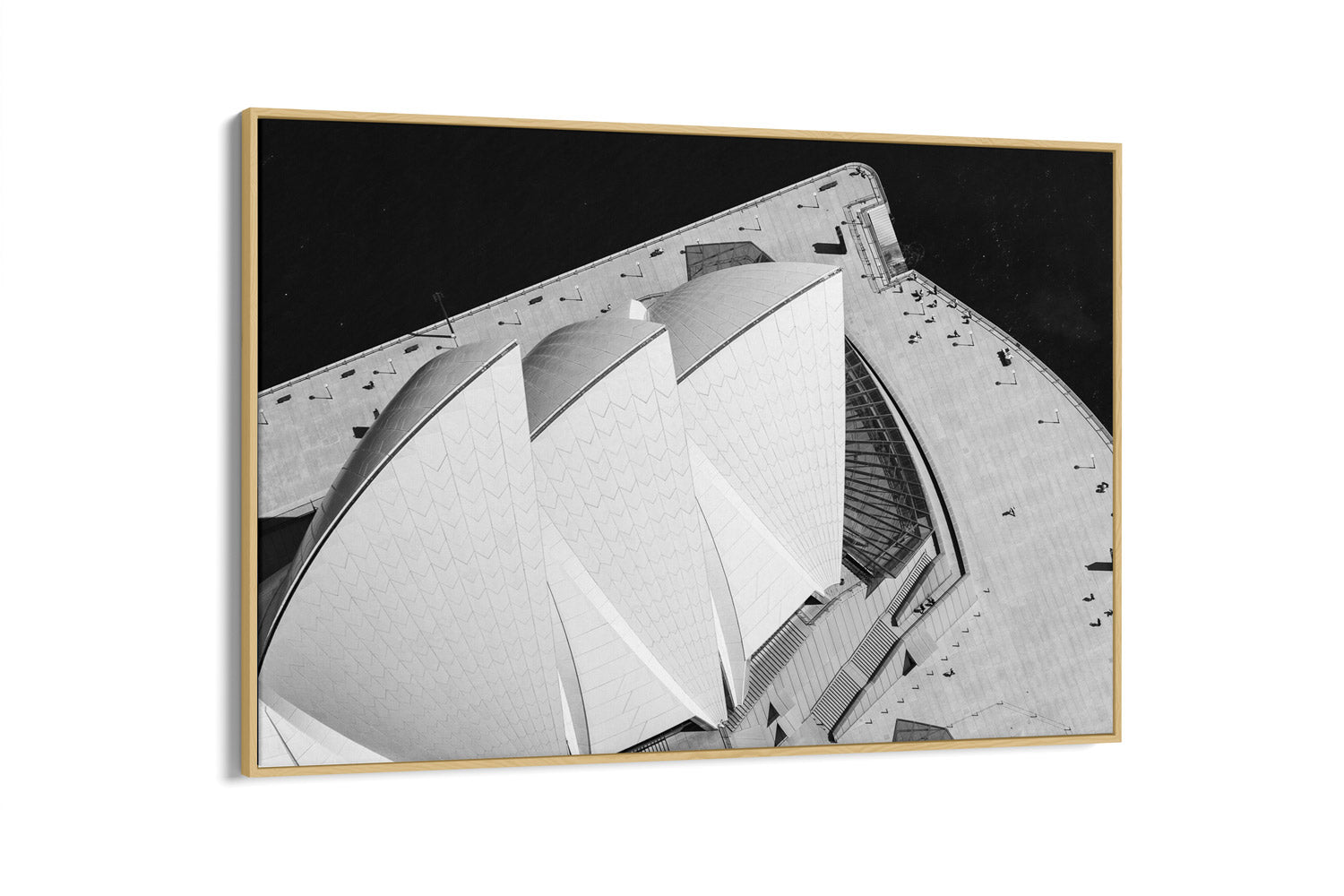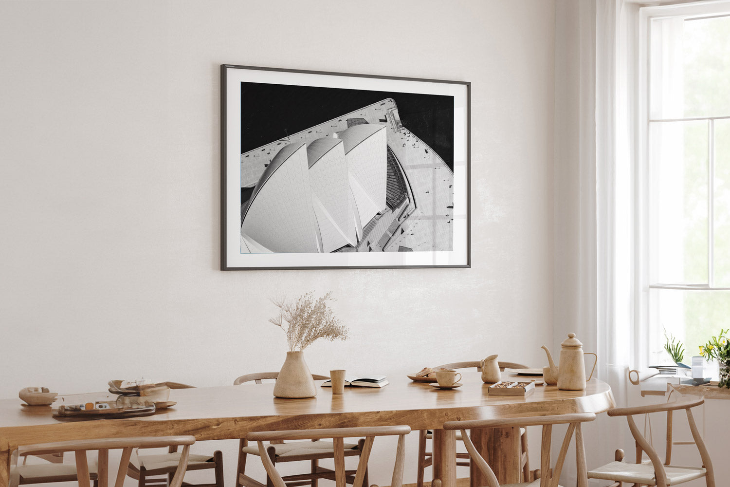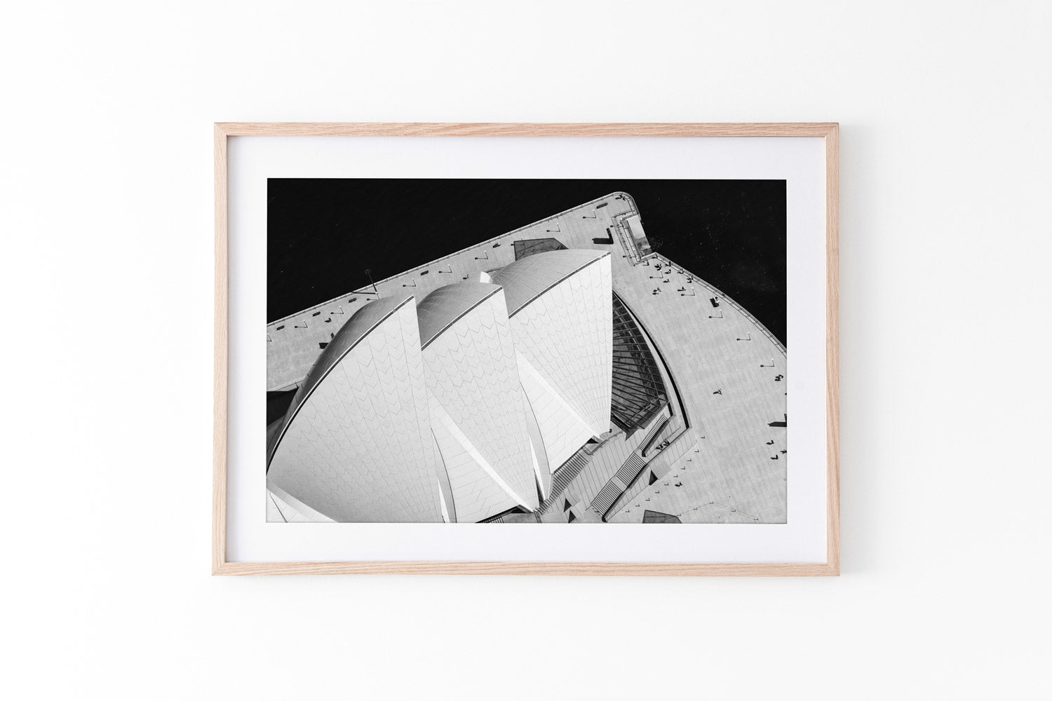 A unique top-down perspective of the Sydney Opera House, photographed from a helicopter in black and white. This fine-art aerial image transforms the iconic structure into a study of form and contrast, revealing new geometric patterns and textures unseen from the ground.