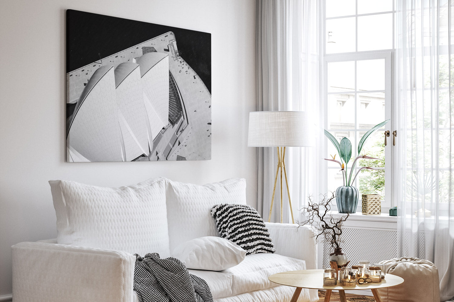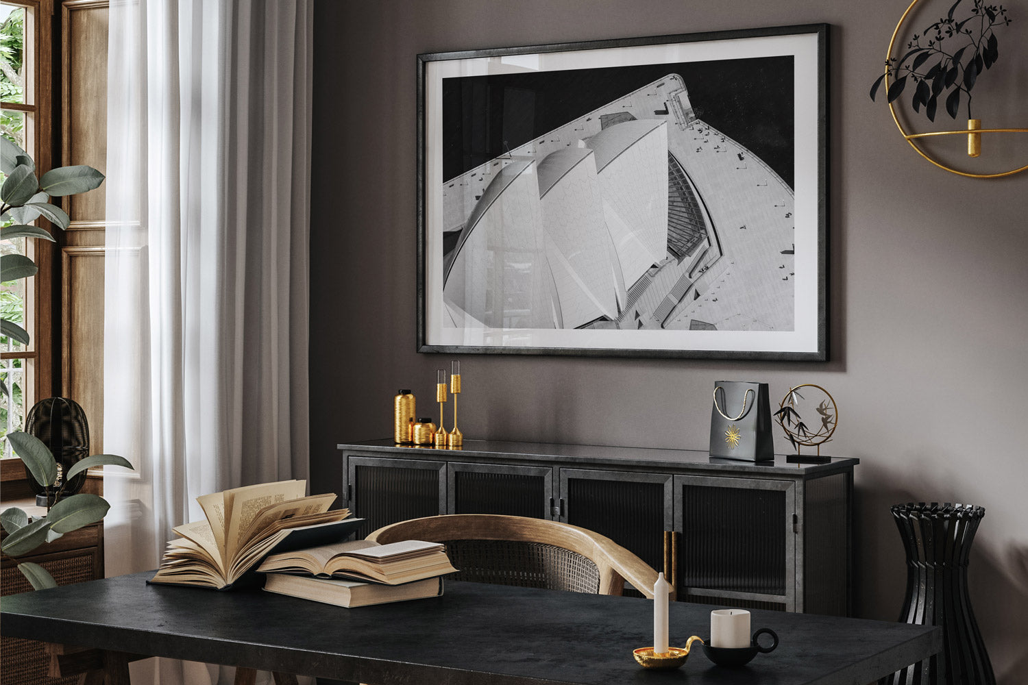 The abstract composition and tonal depth bring a sense of sophistication and quiet drama, making it a perfect centrepiece for modern interiors. Printed on museum-grade materials, this piece celebrates Sydney’s architecture through an artist’s lens.