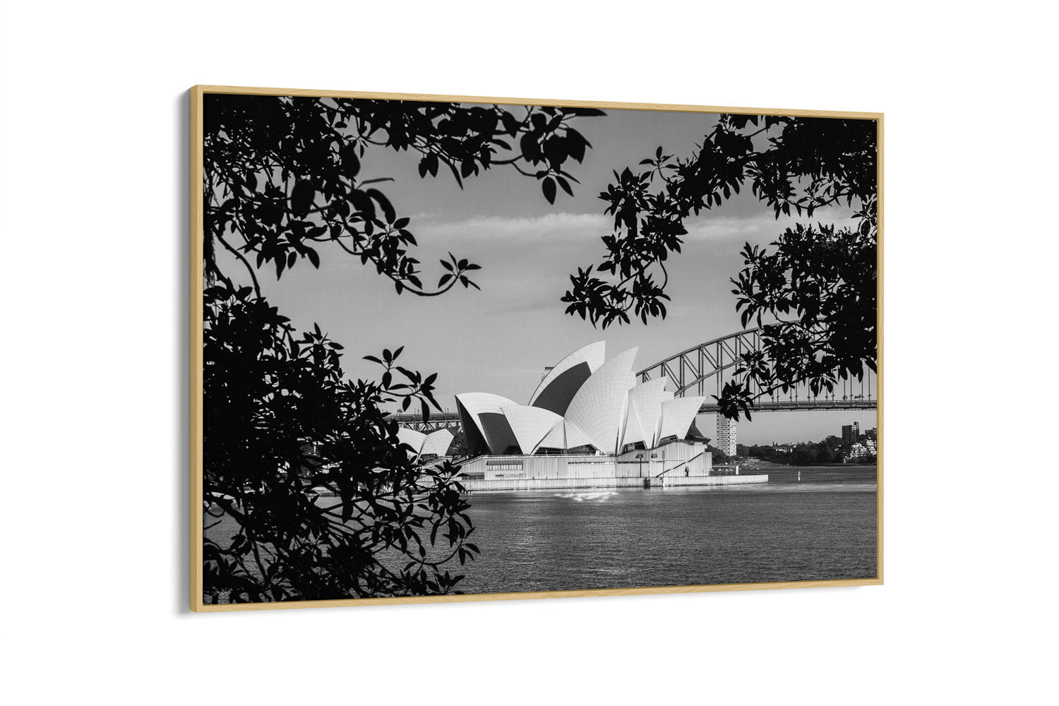 The View is a striking black and white fine art print capturing the Sydney Opera House framed naturally by overhanging trees. This timeless composition balances light and texture, highlighting the Opera House’s architectural curves set against the calm waters of Sydney Harbour.