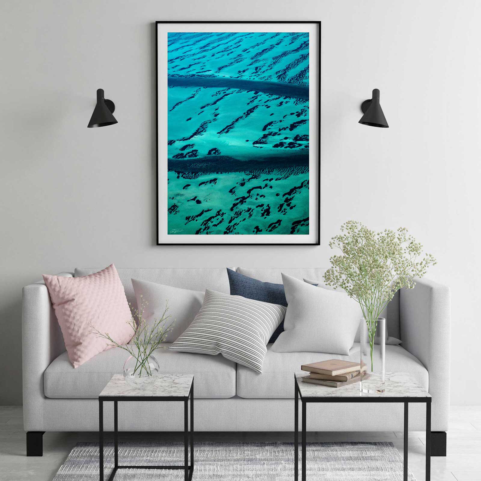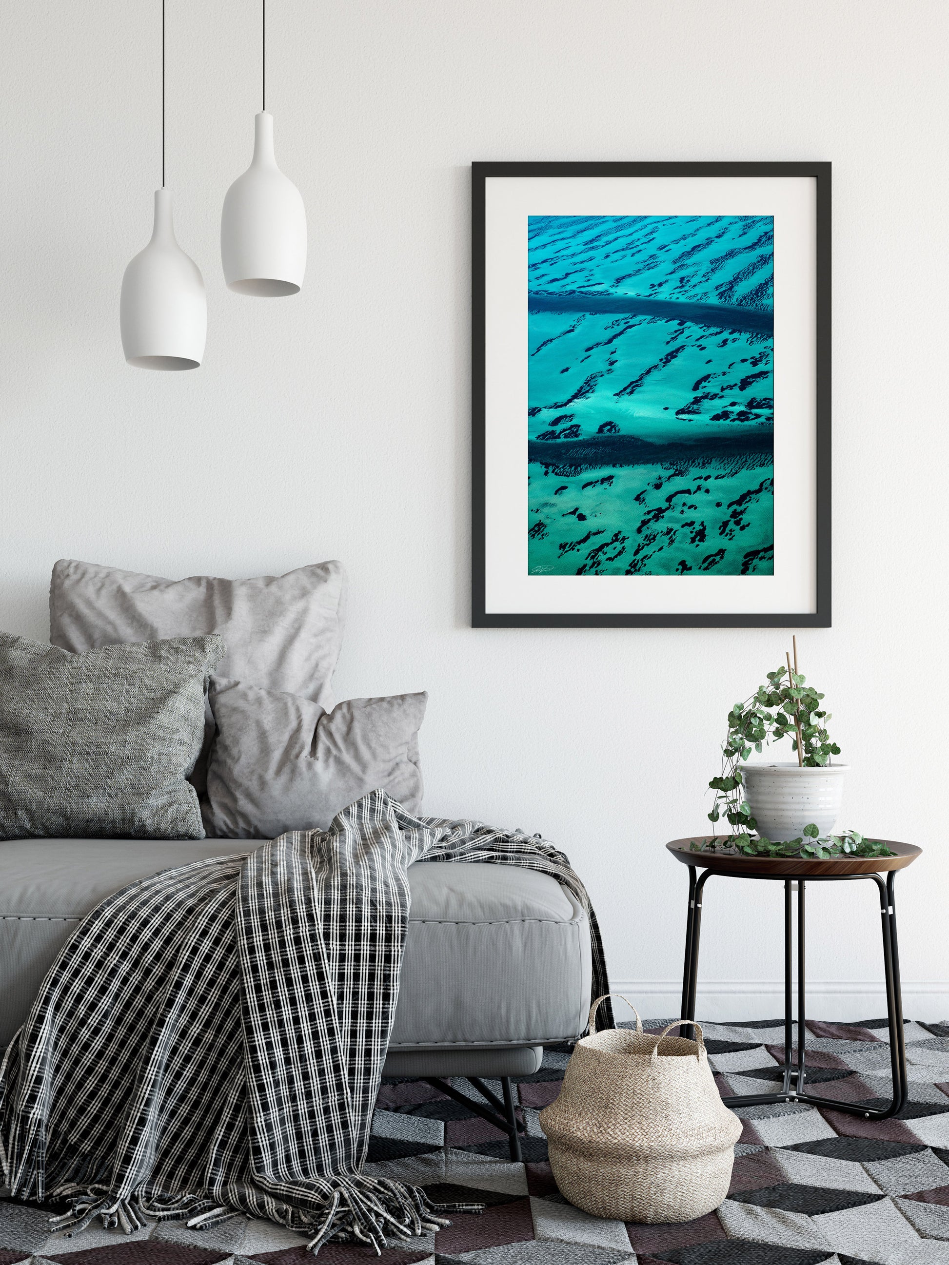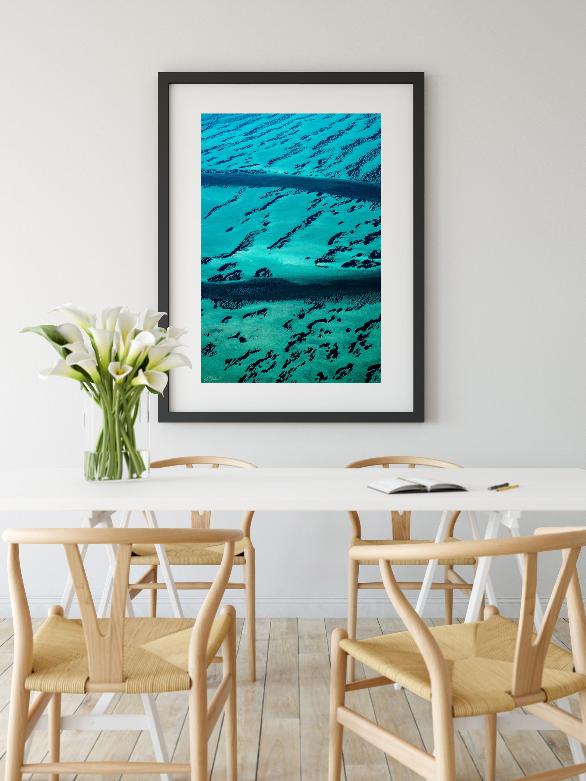 A beautiful display of blue and green colour, mixed with dark seagrass giving a beautiful abstract print. Found in the mid-west coast of Western Australia and featured on David Attenborough's Blue Planet. An amazing display of nature!