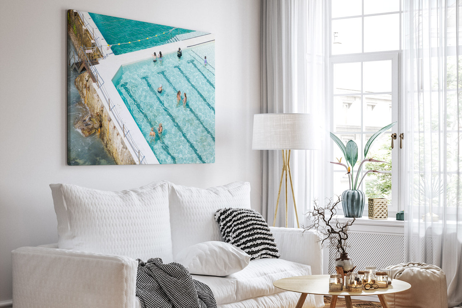 Bondi Icebergs Pool captures the iconic Bondi Icebergs from a relaxed lunchtime perspective. This landscape fine art photograph showcases swimmers drifting through the turquoise water, sunseekers lounging poolside, and the soft shimmer of midday light that makes Icebergs one of the most recognisable ocean pools in the world.