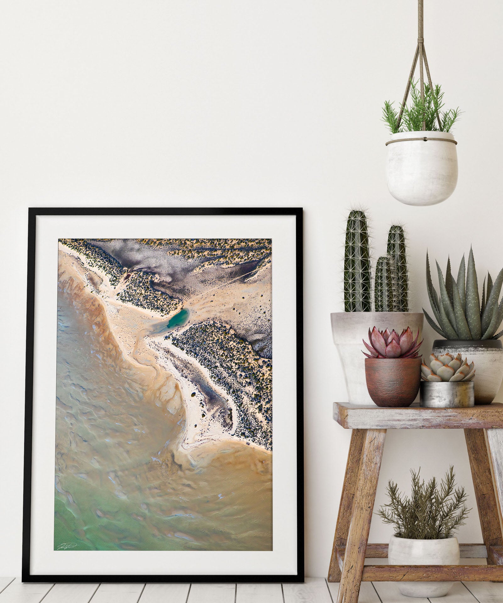 Dubaut Point, located on the easterly side of Shark Bay Western Australia. This beautiful earthy toned abstract print offers an interesting perspective of 4wd tracks and the low tide sands.