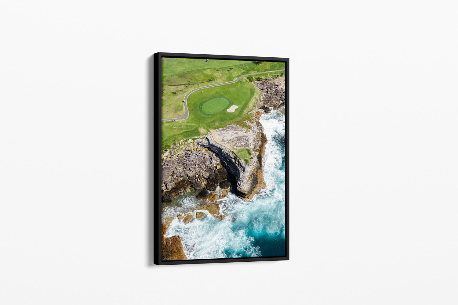 Hole 4 Golf Coast captures a breathtaking portrait aerial view over one of the most dramatic coastal golf holes in Australia. Photographed from a helicopter, this fine art print showcases the sweeping fairway of the fourth hole bordered by rugged cliff faces that drop into the deep blue ocean below.