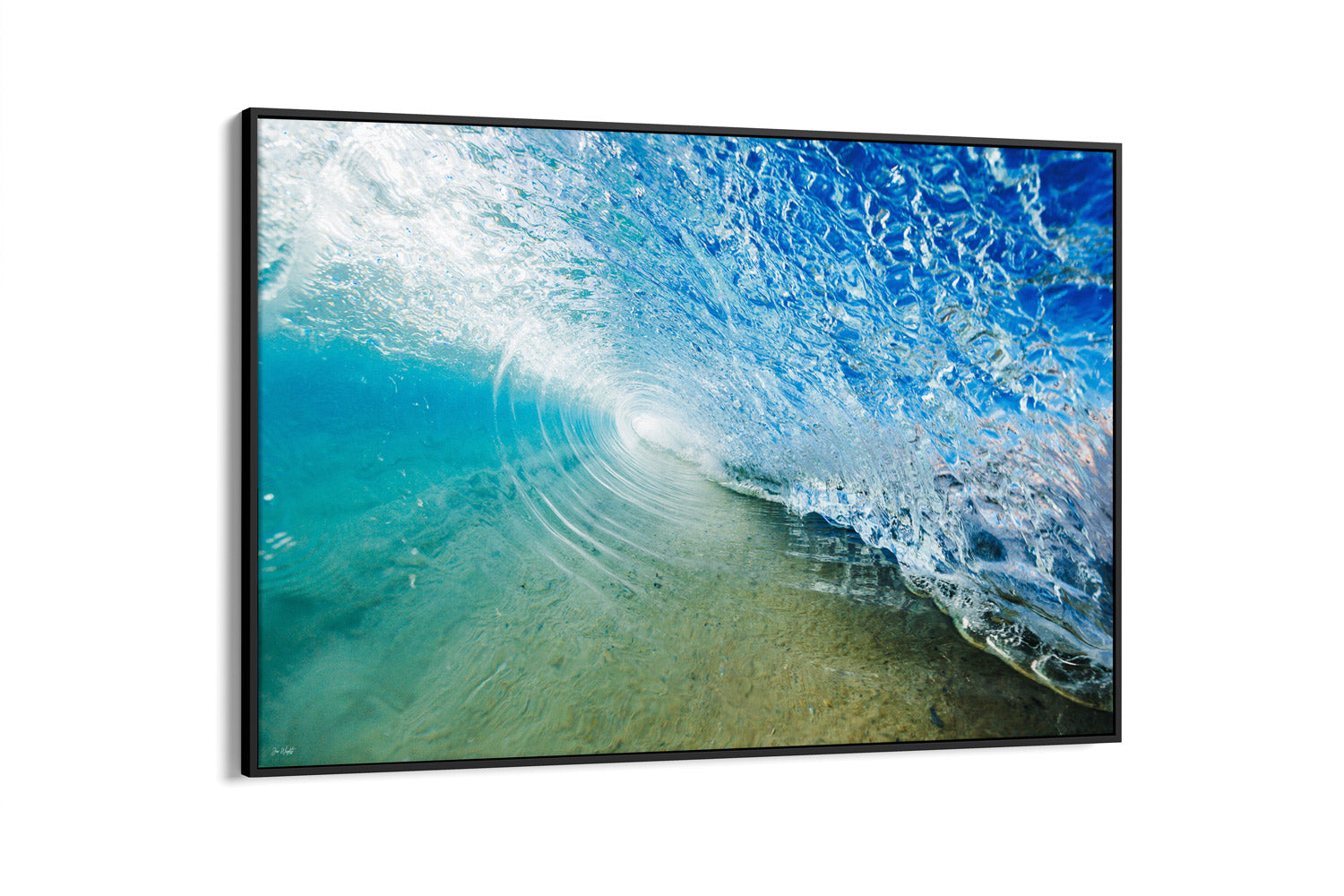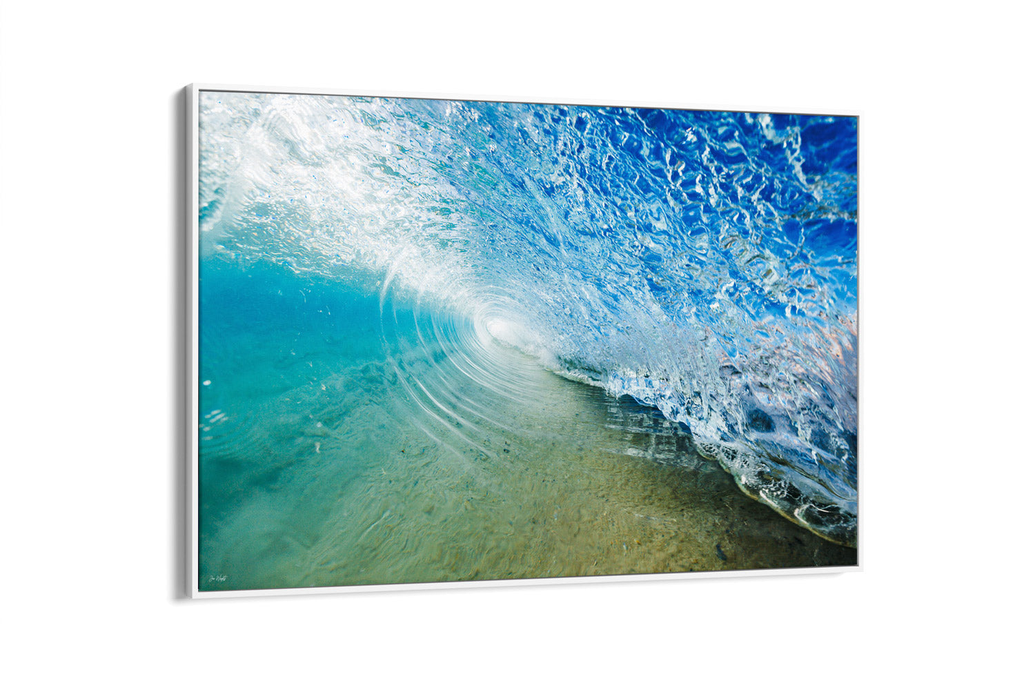 Captured from within the heart of a barrelling wave, Jelly Lips reveals the ocean’s playful yet powerful side. The wave’s lip, rendered in vibrant blues and greens, takes on an almost jelly-like form as it crashes onto the surface, while the clarity of the water allows you to peer through and witness the sand lifting from below. The dynamic energy and unique perspective of this photograph transport you into the wave, offering a glimpse of the ocean’s raw beauty and motion.