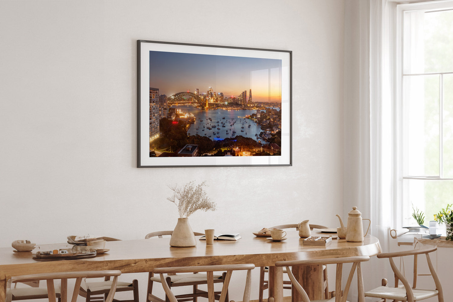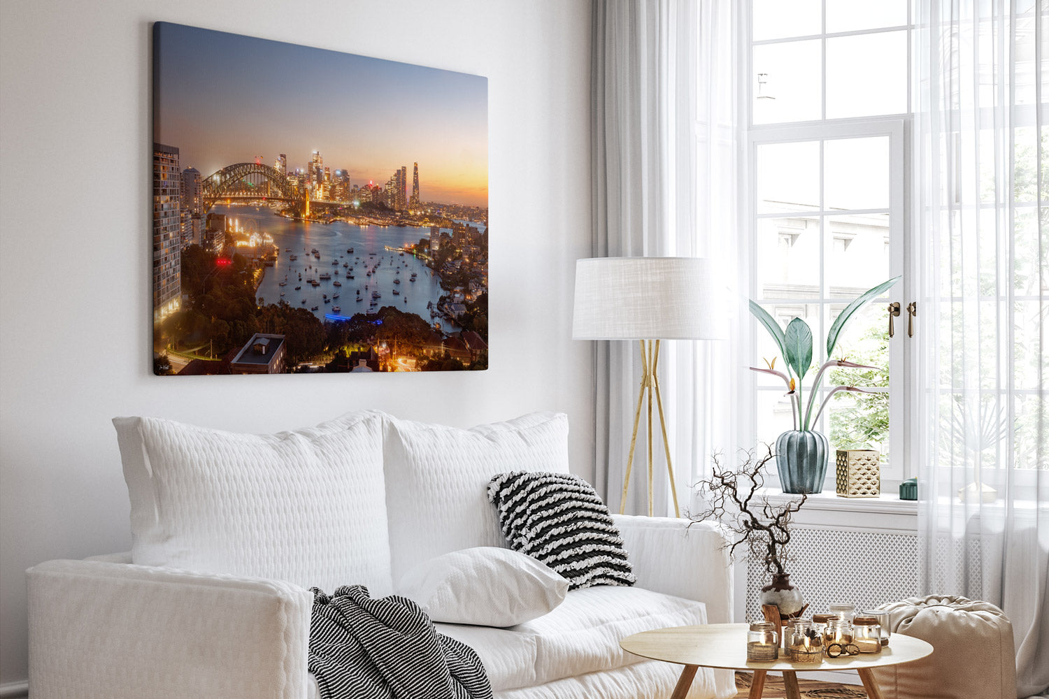 Embrace the warmth of Lavender Bay as golden sunset light bathes the waterfront, illuminating the harbour's architectural gems in honeyed tones. This serene coastal moment invites you to pause and savour the natural splendour that makes this Sydney landmark so cherished, a gentle reminder of the beauty that surrounds us, perfect for bringing calm and inspiration into your home.