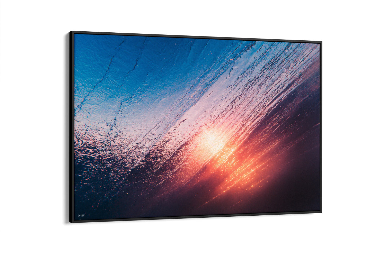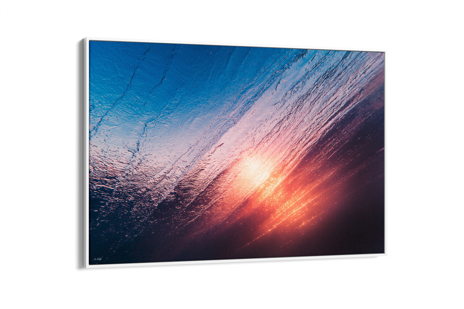 Captured from beneath the surface, Lines of Colour looks back towards the rising sun, where the movement of a passing wave has etched delicate diagonal lines across the frame. The colour gradient transitions beautifully from deep blue to soft pink, fiery orange, and into rich black, creating a mesmerising interplay of light and shadow. A fusion of motion and stillness, this piece transforms the ocean into an abstract masterpiece.