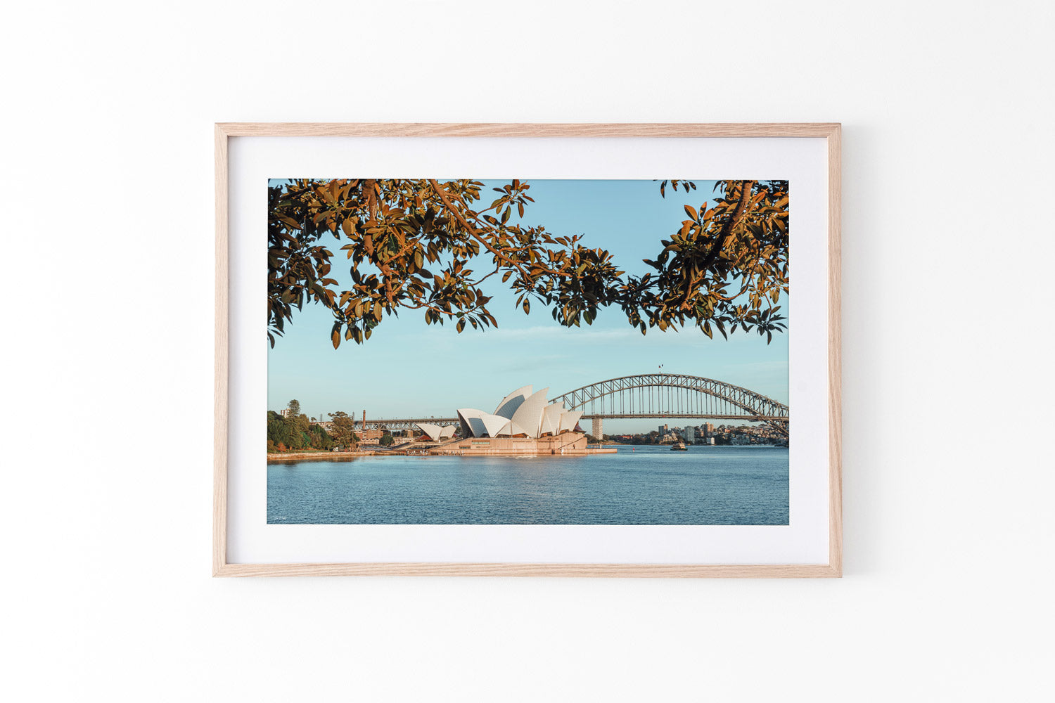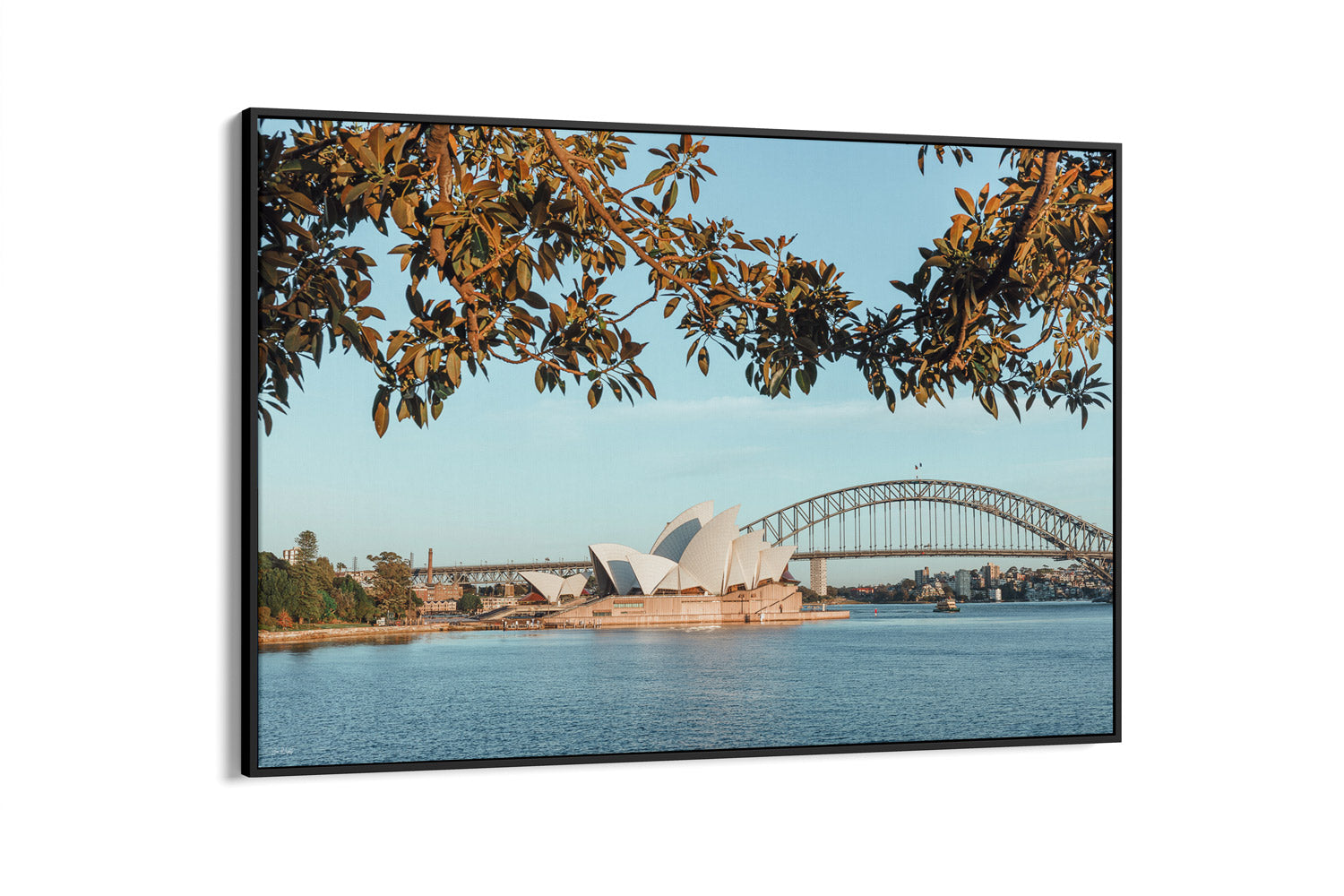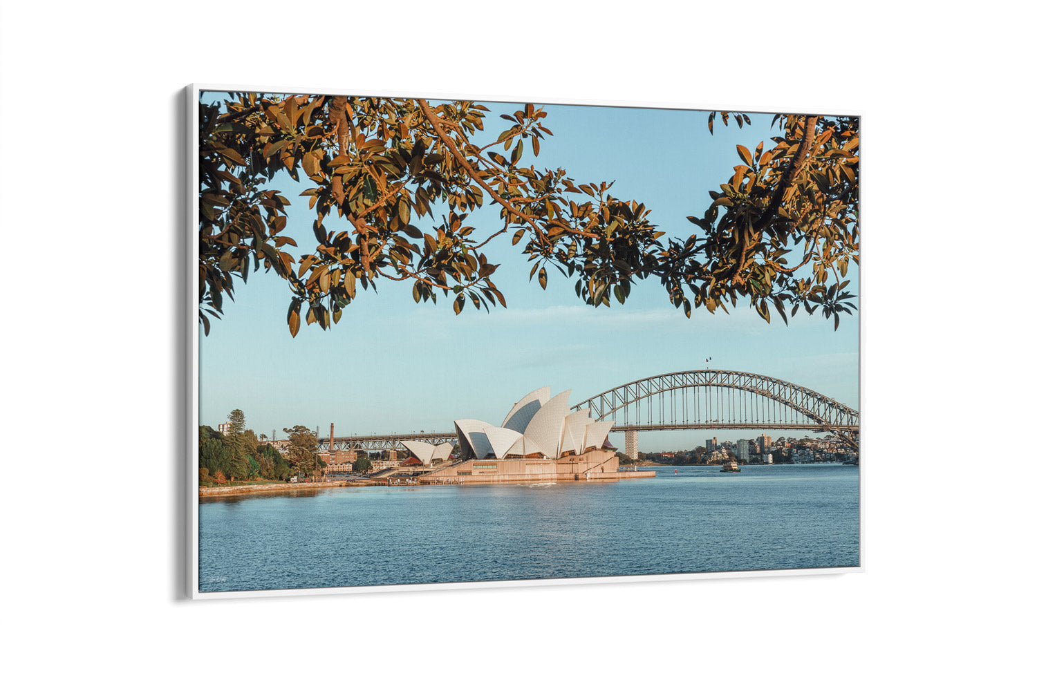 A serene view from one of Sydney’s most famous lookouts, Mrs Macquaries Chair captures both the Opera House and Harbour Bridge framed naturally by trees along the foreshore. The muted colour palette softens the city’s landmarks, creating a tranquil balance between nature and architecture.