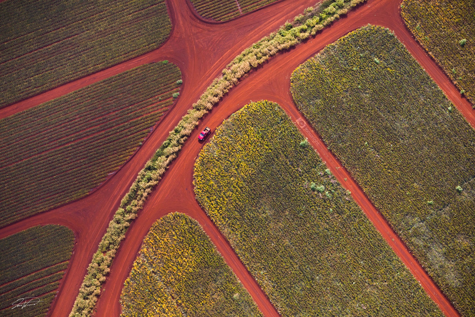 A beautiful display of earth tones, earth reds and yellows in this image of pineapple crops in Hawaii.