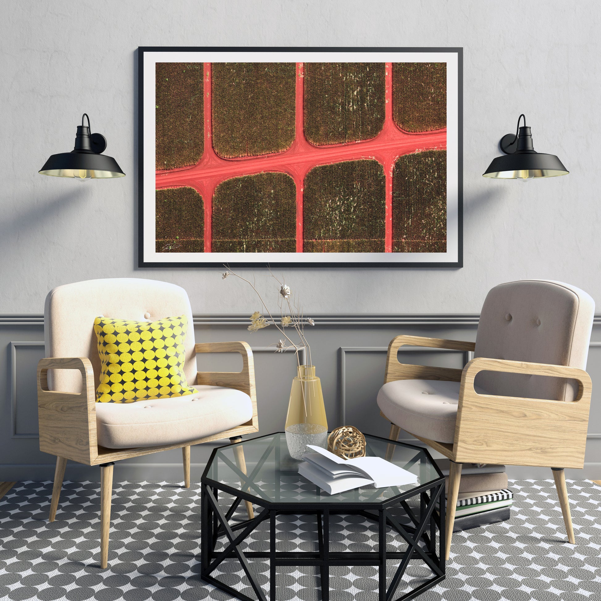 An abstract aerial photograph of Pineapple fields in Hawaii. Taken whilst flying in a helicopter, this bird's eye view gives a unique perspective of agriculture in Hawaii. The red soil pops in contrast to the pineapple fields giving some beautiful earth tones.