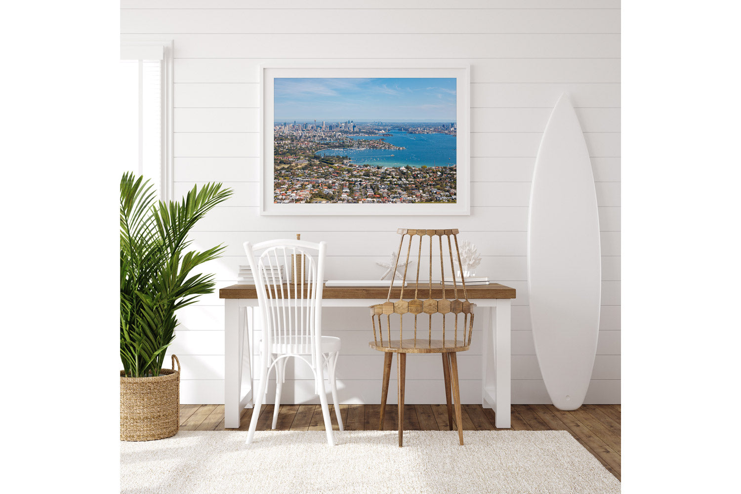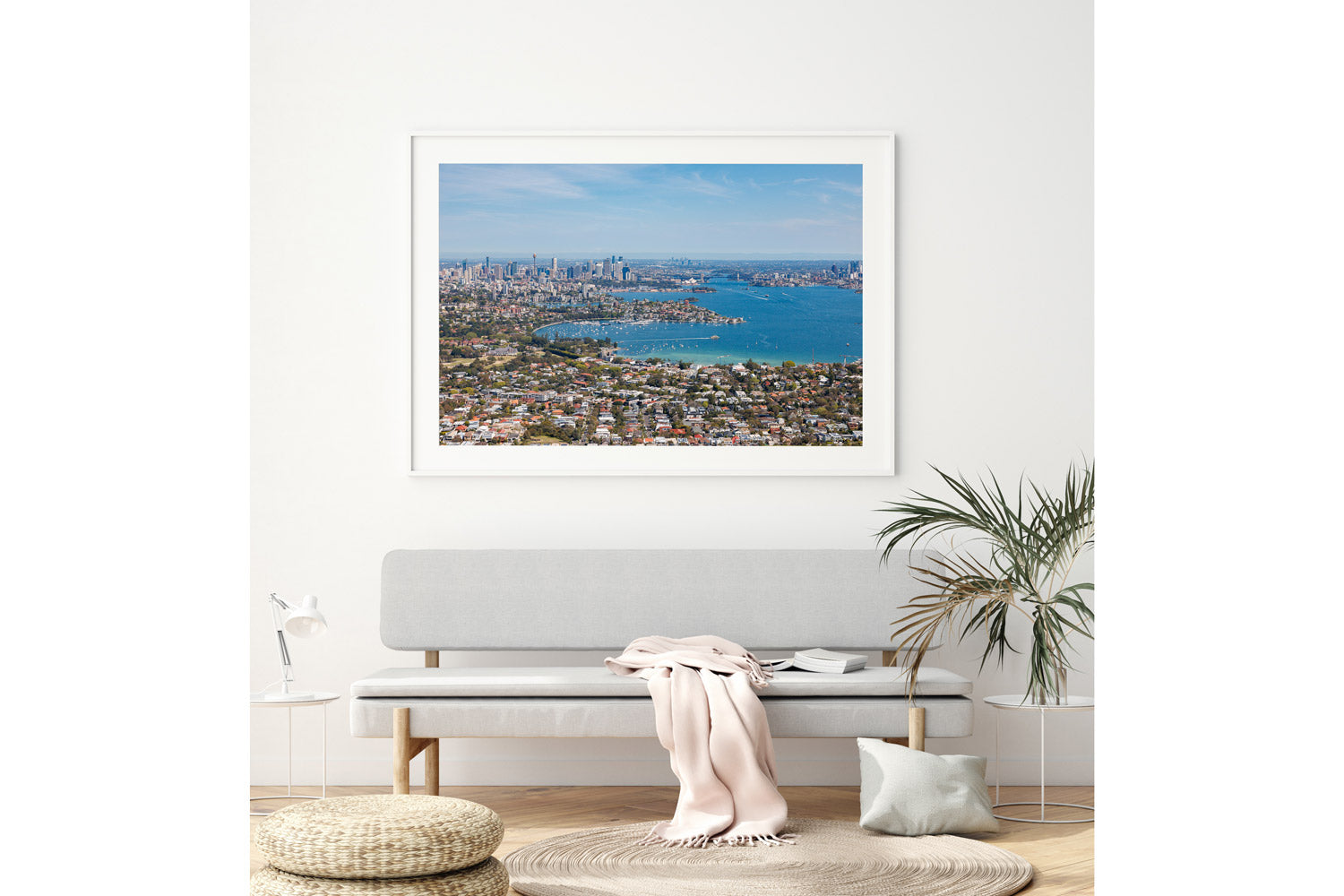 Rose Bay Aerial Print captures a sweeping elevated view across Sydney Harbour, looking over the calm blue water toward the city skyline in the distance. Photographed from a helicopter, this fine art image reveals the boats of Rose Bay, the gentle curves of the shoreline, and the sparkling harbour stretching toward Sydney’s iconic cityscape.