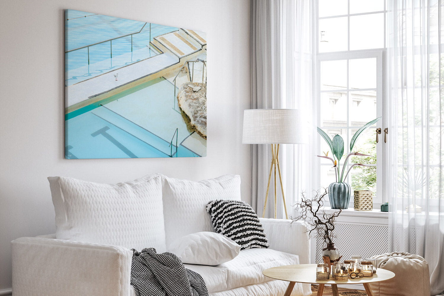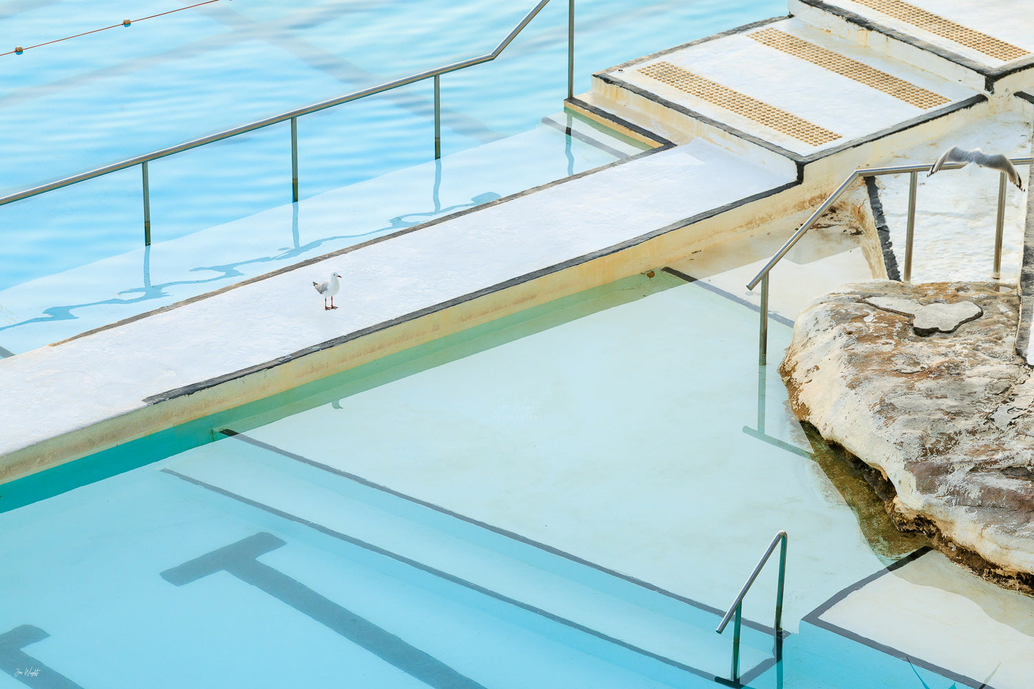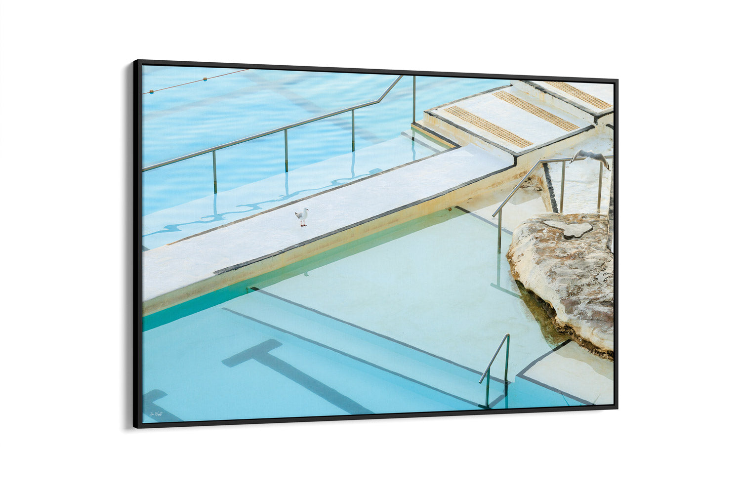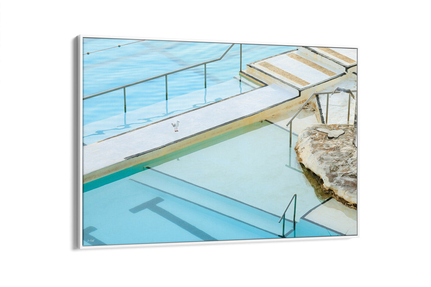 The geometric patterns of Bondi's legendary Icebergs pool transform into an abstract study of line and form in this captivating print. Look closely, and you'll discover two seagulls nestled within the composition, a delightful detail that rewards closer inspection. Perfect for those who appreciate layered imagery and the artistic potential hidden in everyday coastal scenes.