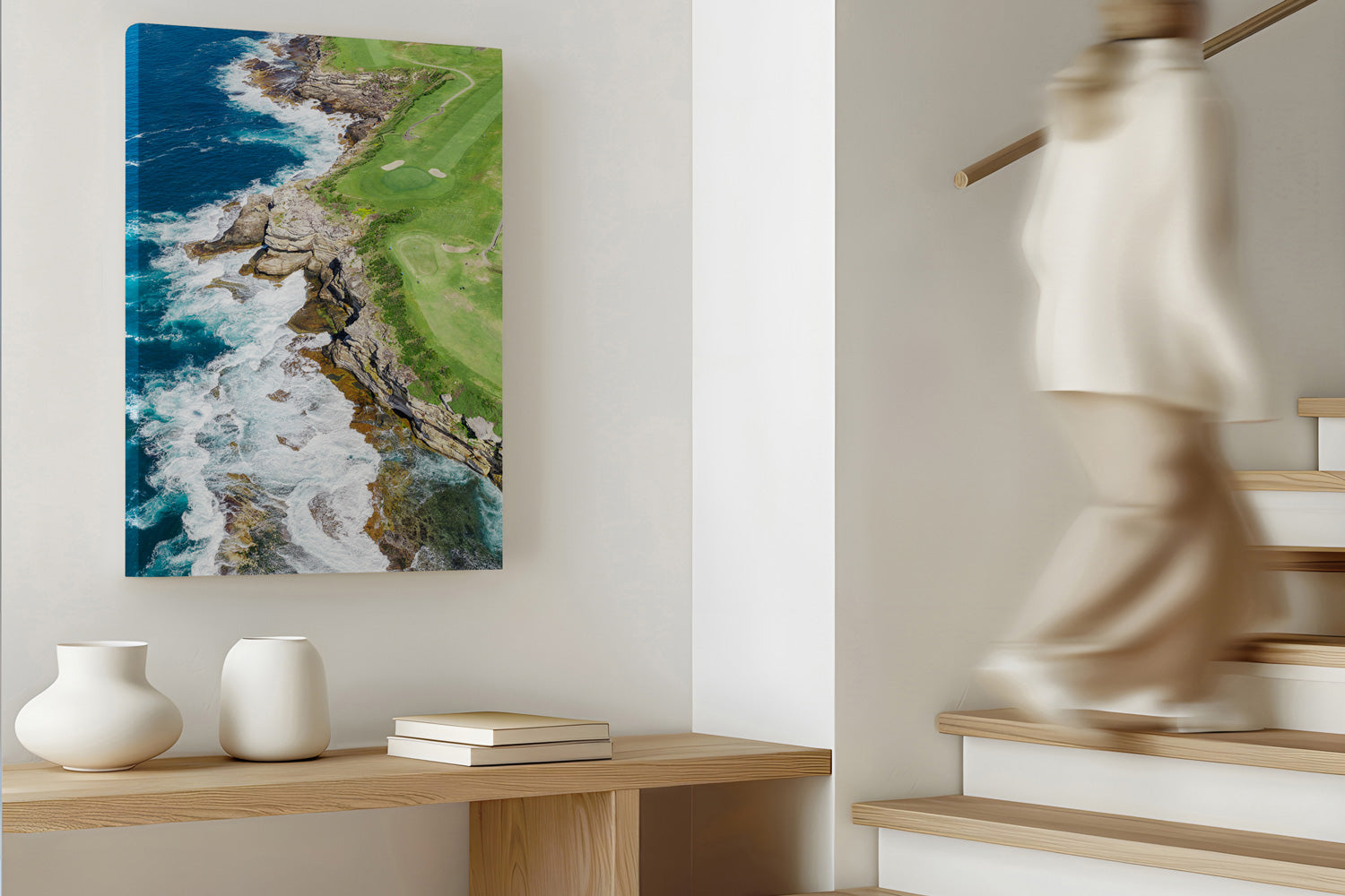 Shore Fore captures the perfect meeting point between ocean energy and golfing precision. This portrait aerial print reveals a dramatic section of coastline where the rolling blue surf collides with the sculpted edge of a coastal golf course. The rich greens of the fairway contrast beautifully with the textured rock formations and deep ocean tones, creating a striking and balanced composition.