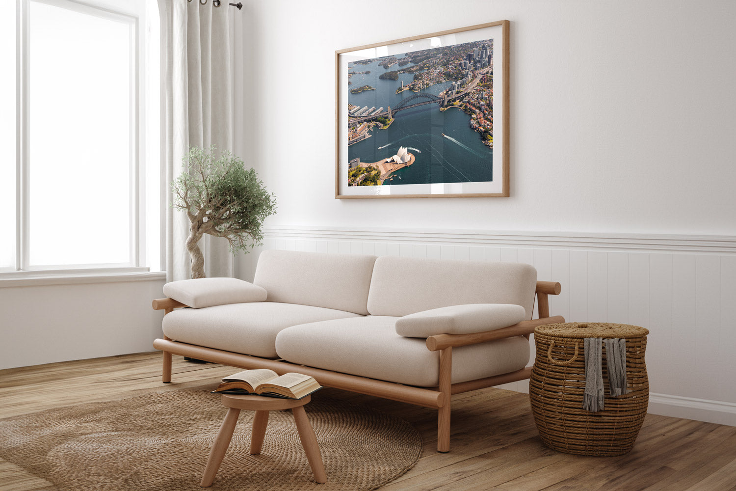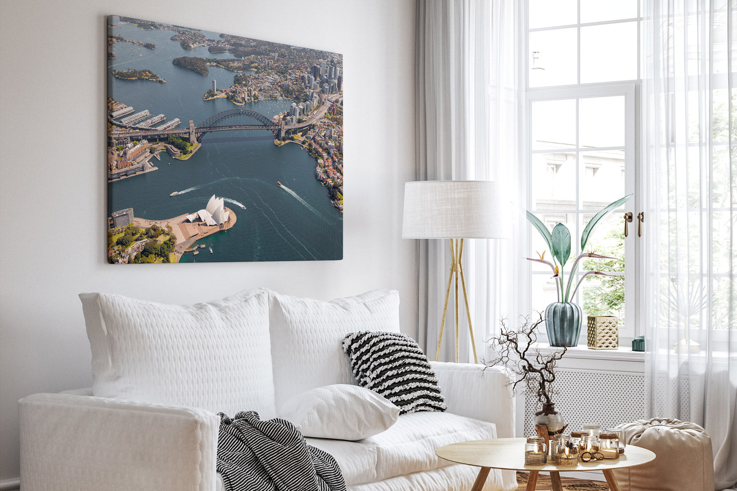 Sydney Harbour Aerial Print captures the timeless beauty of Sydney from above in soft, muted tones. This fine art photograph showcases the Sydney Opera House and Harbour Bridge surrounded by the calm waters of the harbour, creating a sense of balance and serenity.